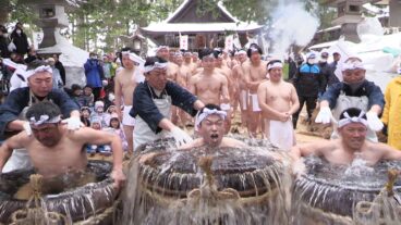 子どもたちの声援を受け冷水に飛び込む男衆 鬼沢のハダカ参り