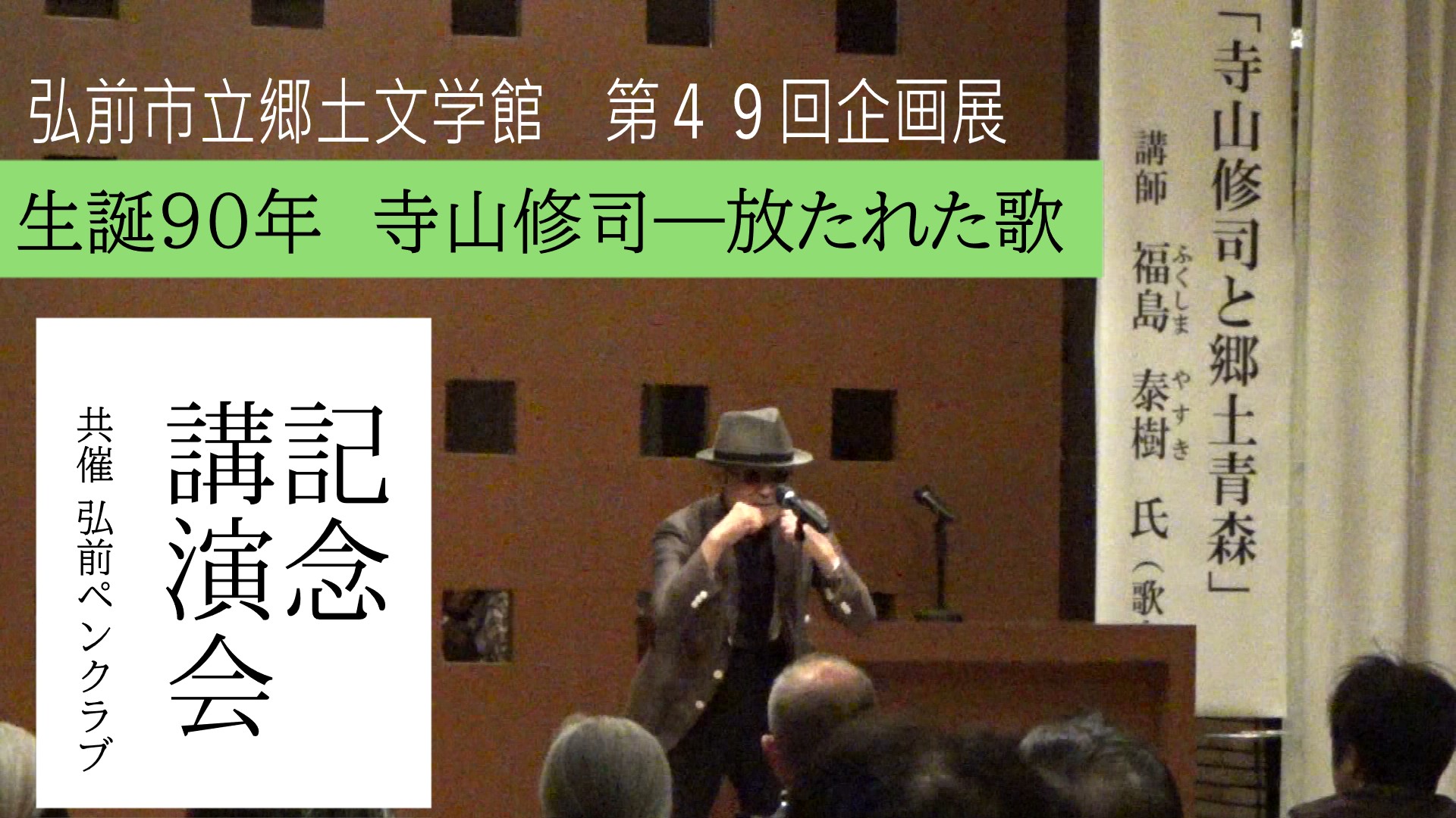 10月11日、弘前プラザホテルで弘前市立郷土文学館 第49回企画展「生誕90年 寺山修司ー放たれた歌」の記念講演会が開催されました。講師を務めたのは「短歌絶叫コンサート」を創出した歌人・福島泰樹氏。「寺山修司と郷土青森」をテーマに寺山修司とのエピソードや詩などを紹介し、講演会終盤では短歌や詩の朗読パフォーマンスを披露しました。
