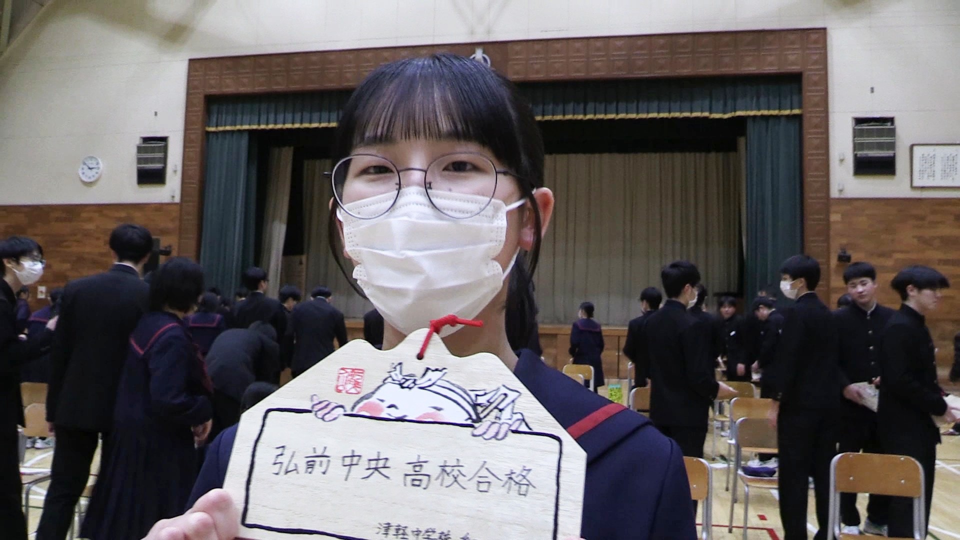 絵馬に誓うサクラサク 津軽中学校で合格祈願集会 学生生活 投稿日:2026年01月30日 1月29日、津軽中学校の体育館で合格祈願集会が行われ岩木ボランティアクラブ(旧岩木ライオンズクラブ)が、参加した約70名の3年生に合格祈願絵馬を寄贈しました。絵馬を受け取った生徒たちは志望校合格への願いやそれぞれの目標などを書き込み決意を新たにしていました。生徒たちの想いが書き込まれた絵馬は岩木ボランティアクラブが受け取り、その日のうちに高照神社に奉納されたということです。