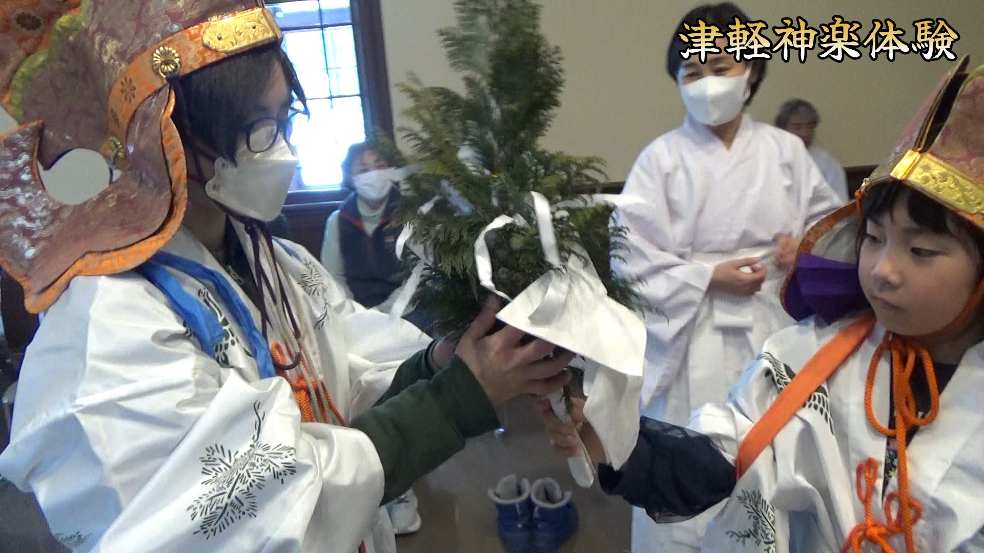 ワークショップでは、津軽神楽保存会による津軽神楽の演目「榊葉」の実演をはじめ、衣装・小道具等の展示、参加した子どもたちを中心に衣装の試着や太鼓演奏の体験などが行われました。