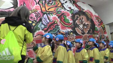 板柳町で開催の平山鳳春ねぷた絵展 ふじこども園が見学