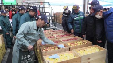 船沢小学校の児童たちが収穫したりんご 目の前で高値で取引